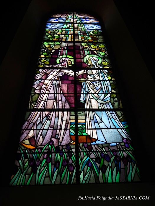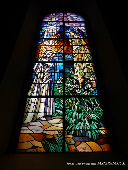 -Witraże przedstawiają sceny z życia Matki Bożej.