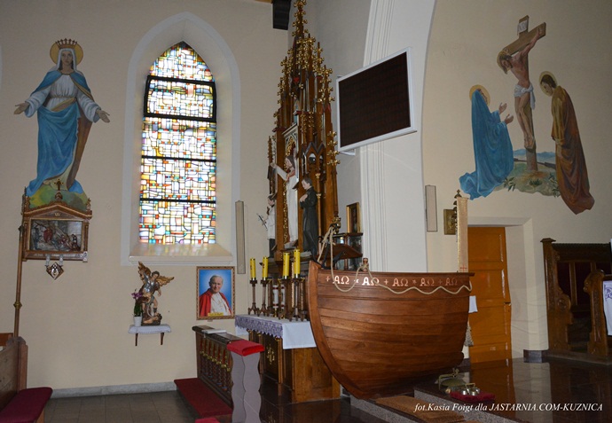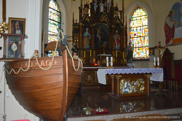 przypomina wystrój kościoła z elementami rybackimi, drewniana
